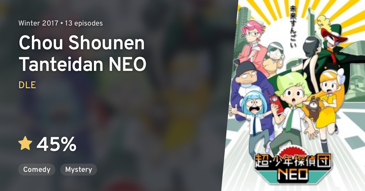 Chou Shounen Tanteidan NEO Episodes Streams is an anime from studio DLE Inc that falls into the main genre of Comedy. The series will follow the descendant of Kobayashi from Edogawa Ranpos series of detective novels. Please rest assured that.